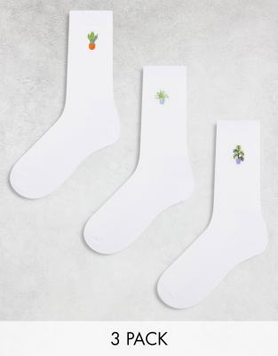 ASOS DESIGN - Confezione da 3 paia di calzini alla caviglia bianchi con ricami di piante domestiche