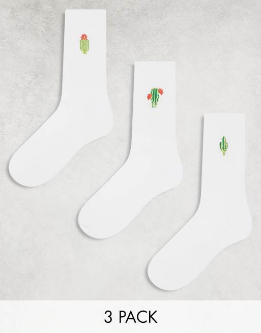 ASOS DESIGN - Confezione da 3 paia di calzini bianchi con cactus ricamati