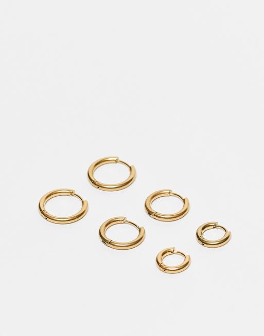 ASOS DESIGN - Confezione da 3 paia di orecchini a cerchio da 9 mm, 12 mm e 14 mm in acciaio inossidabile dorato resistente all'acqua