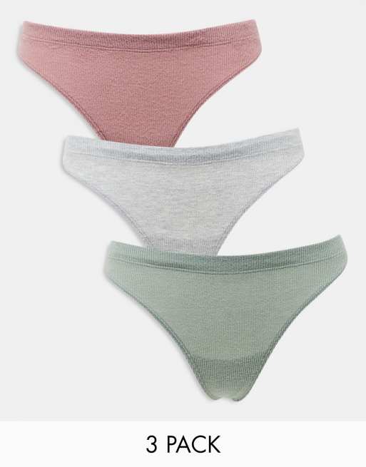 ASOS DESIGN - Confezione da 3 perizomi morbidi a coste rosa polvere, kaki, grigio