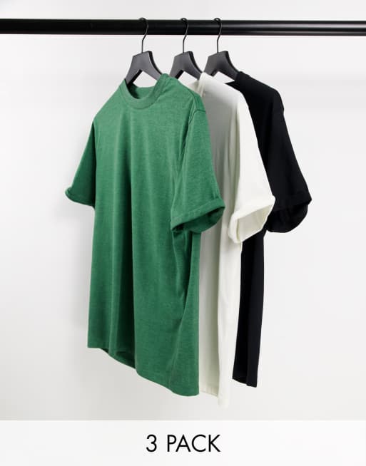 ASOS DESIGN - Confezione da 3 T-shirt con maniche arrotolate verde, bianca e nera