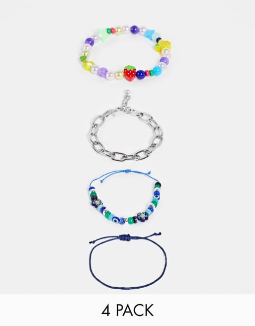ASOS DESIGN - Confezione da 4 bracciali da festival divertenti con ciondoli in pietre miste e catenina blu