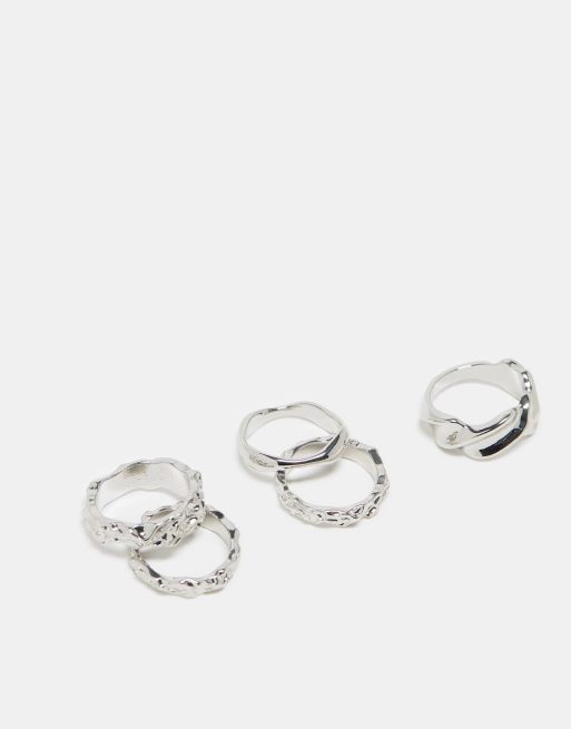 ASOS DESIGN - Confezione da 5 anelli con design misti effetto metallo fuso argentati