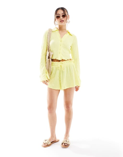ASOS DESIGN - Coordinato con camicia con maniche svasate e pantaloncini morbidi giallo limone