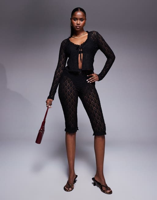 ASOS DESIGN - Coordinato con pantaloni Capri e top a maniche lunghe nero in pizzo con scollo ampio, volant sui bordi e allacciatura