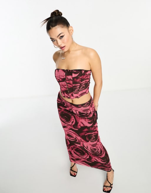ASOS DESIGN - Coordinato con top a corsetto e gonna midi a vita bassa con stampa di rose