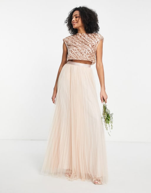 ASOS DESIGN - Coordinato con top da damigella con paillettes e fiocco sul retro, color champagne