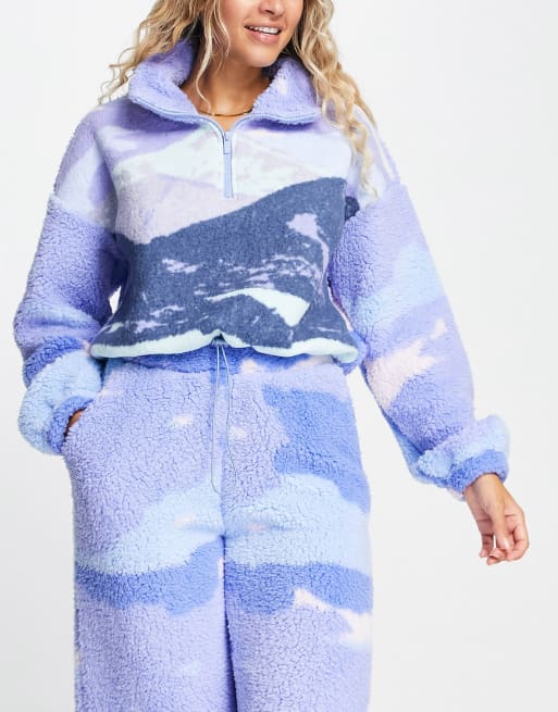 ASOS DESIGN - Coordinato da casa in comodo pile blu con con stampa di paesaggio