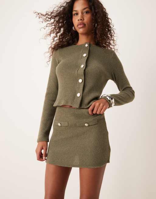 ASOS DESIGN - Coordinato kaki a coste spazzolato con cardigan a maniche lunghe e minigonna