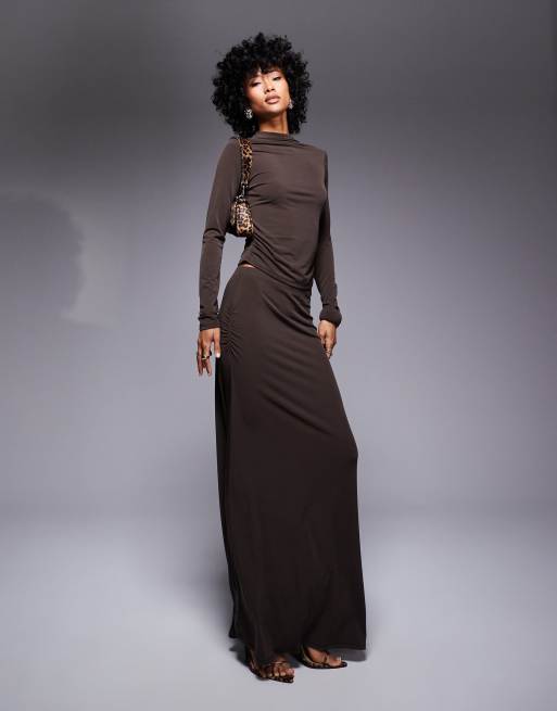 ASOS DESIGN - Coordinato marrone composto da gonna lunga e top a maniche lunghe arricciato con collo alto