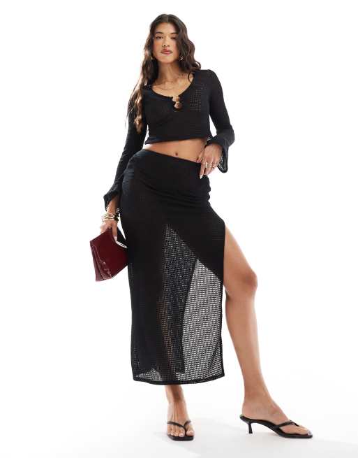 ASOS DESIGN - Coordinato nero testurizzato con top con apertura a goccia con scollo profondo e gonna lunga