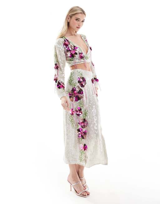 ASOS DESIGN - Coordinato premium con crop top e gonna midi con fiori 3D argento e rosa