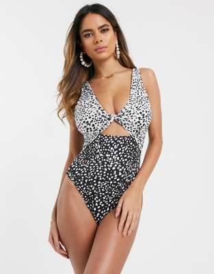 ASOS DESIGN Coppe Grandi - Costume da bagno con incrocio sul davanti con cut-out e stampa mista a pois bianco e nero