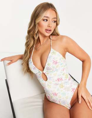 ASOS DESIGN - Costume da bagno arricciato con apertura a goccia sul davanti e stampa floreale