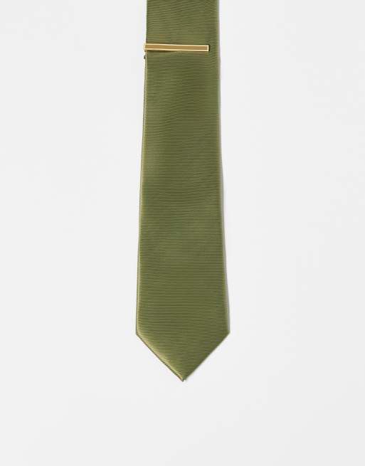 ASOS DESIGN - Cravatta in raso verde con fermacravatta