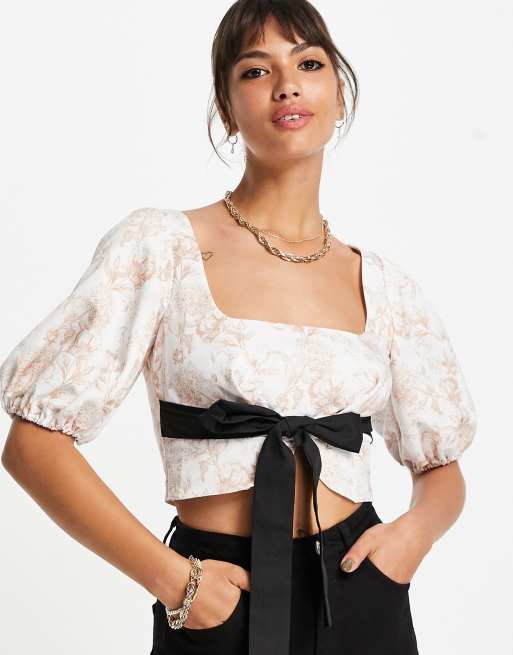 ASOS DESIGN - Crop top a fiori con maniche a sbuffo e scollo quadrato con allacciatura in vita a contrasto
