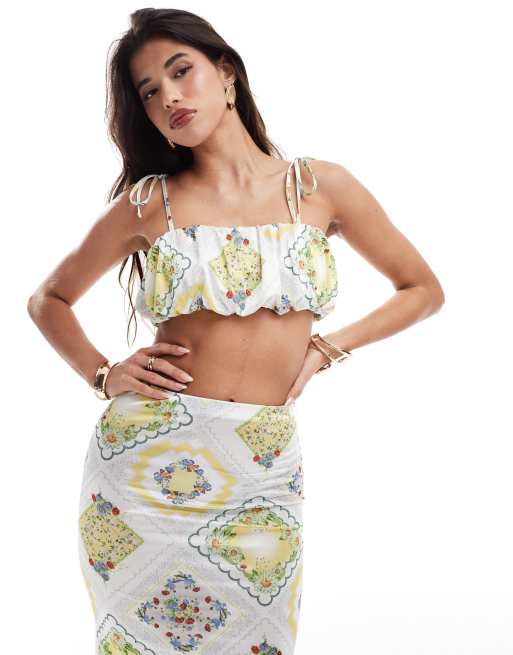 ASOS DESIGN - Crop top arricciato stile canottiera con stampa stile tovaglia in raso e twill in coordinato