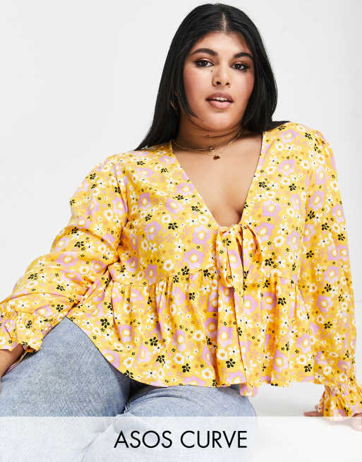 ASOS DESIGN Curve - Blusa a maniche lunghe allacciata sul davanti con polsini arricciati arancione
