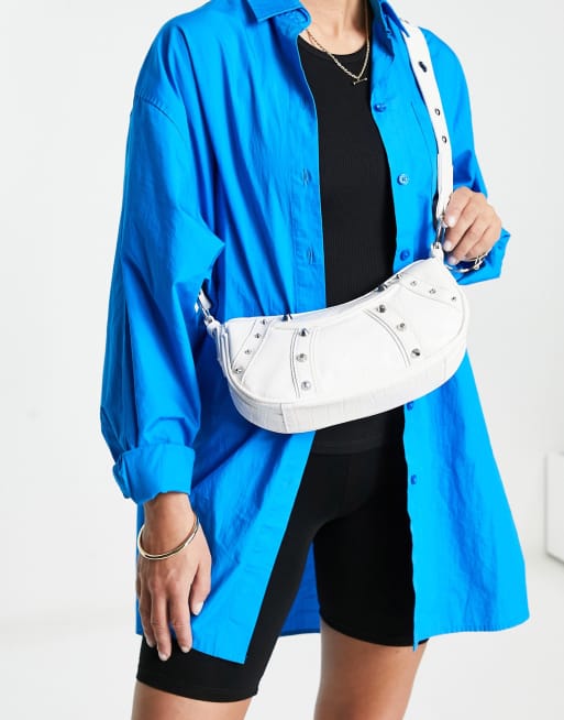 ASOS DESIGN Curve - Borsa a tracolla curva bianco coccodrillo con borchie