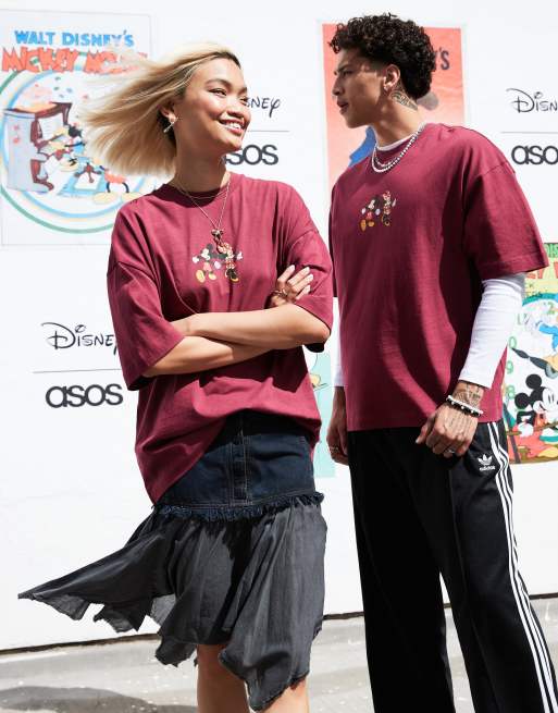 ASOS DESIGN - Disney - T-shirt oversize unisex bordeaux con stampa di Topolino e Minnie