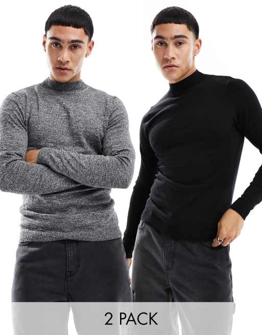 ASOS DESIGN - Essential - Confezione da 2 maglioni dolcevita attillati nero e grigio mélange
