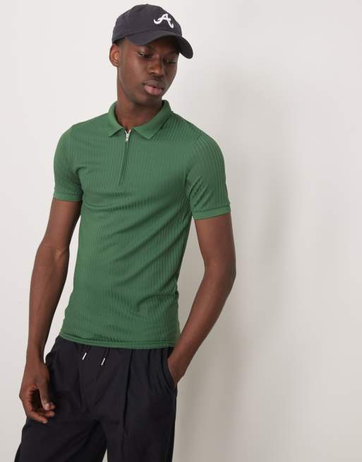 ASOS DESIGN - Essential - Polo a maniche lunghe attillata verde scuro a coste con zip