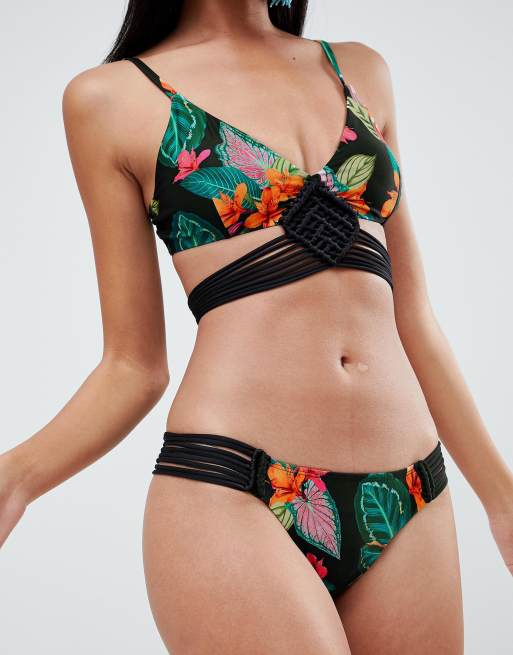 ASOS DESIGN Exotic Leaf Print Hand Macrame Tanga Bikini Bottom