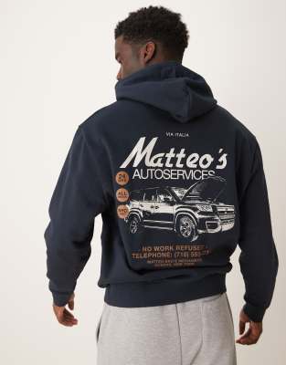 ASOS DESIGN - Felpa con cappuccio blu navy con stampa di automobile sul petto e sul retro
