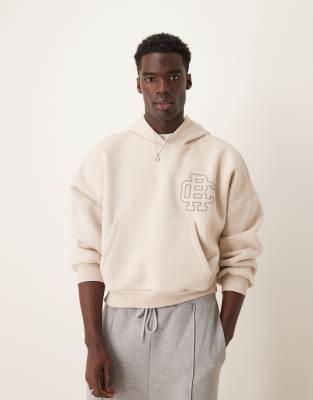 ASOS DESIGN - Felpa con cappuccio corta oversize con spalle scese avena mélange con stampa college sul petto