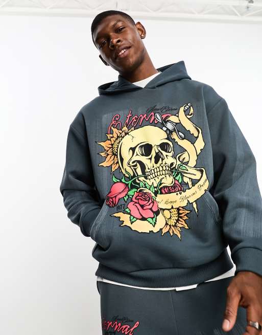 ASOS DESIGN - Felpa con cappuccio oversize antracite slavato con stampa grunge sul retro in coordinato