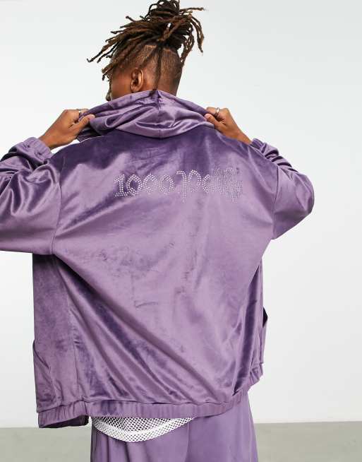 ASOS DESIGN - Felpa con cappuccio oversize in velour viola con zip e scritta in strass