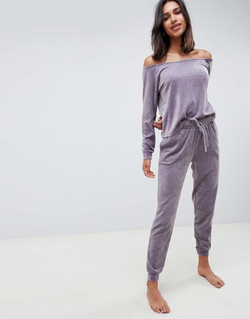 ASOS DESIGN - Felpa con spalle scoperte e joggers da casa in velour