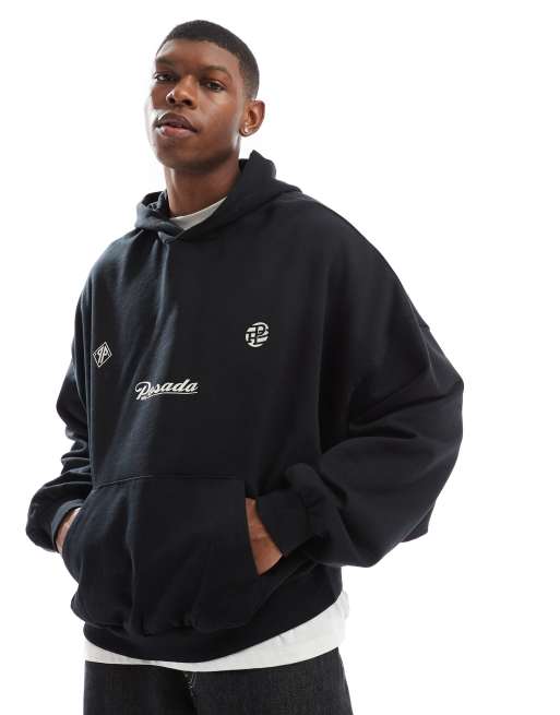ASOS DESIGN - Felpa super oversize con cappuccio e stampe sul petto nera