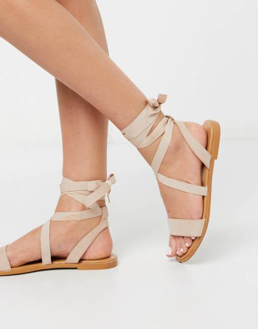 ASOS DESIGN - Finland - Sandali bassi beige con allacciatura alla gamba