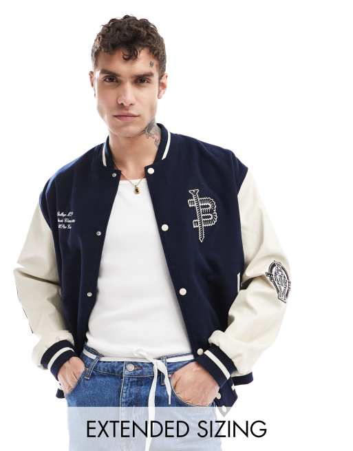 ASOS DESIGN - Giacca college oversize con maniche in pelle sintetica blu navy