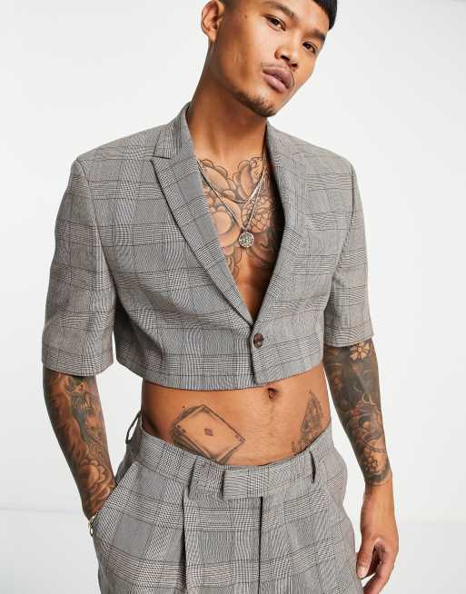 ASOS DESIGN - Giacca da abito super corta a maniche corte marrone a quadri