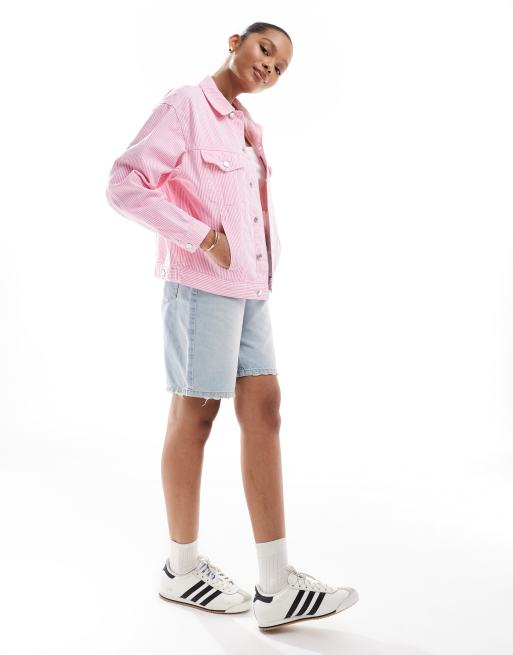 ASOS DESIGN - Giacca di jeans rosa a righe con maniche a sbuffo