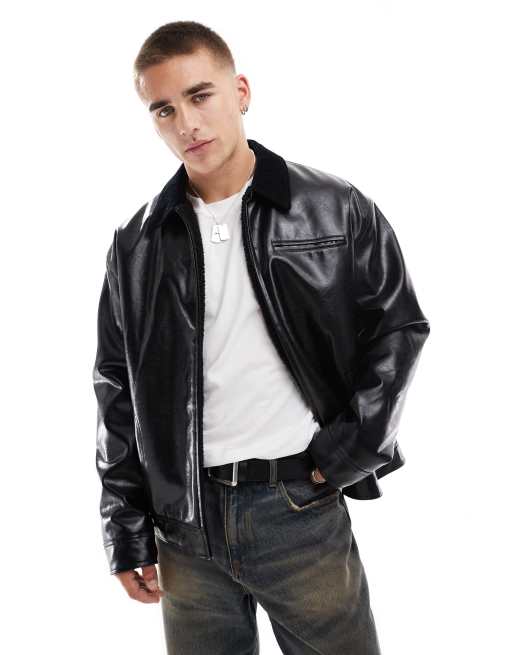 ASOS DESIGN - Giacca harrington oversize in pelle sintetica nera con colletto in velluto a coste