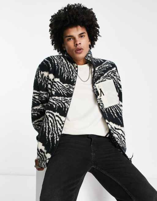 ASOS DESIGN - Giacca oversize con zip in pile borg nero con stampa