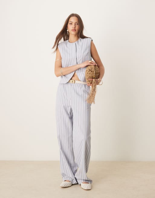 ASOS DESIGN - Gilet squadrato e pantaloni blu a righe bianche in misto lino con cut-out