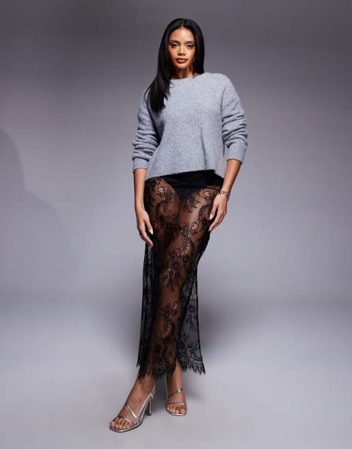 ASOS DESIGN - Gonna lunga in delicato pizzo trasparente nero