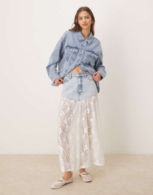 ASOS DESIGN - Gonna lunga in denim lavaggio blu chiaro con orlo in pizzo
