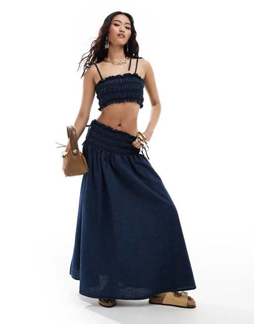 ASOS DESIGN - Gonna lunga in denim morbido blu scuro nero con vita arricciata in coordinato