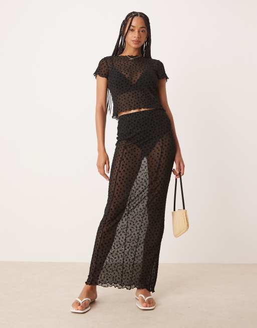 ASOS DESIGN - Gonna lunga in rete nera trasparente floccata a fiori