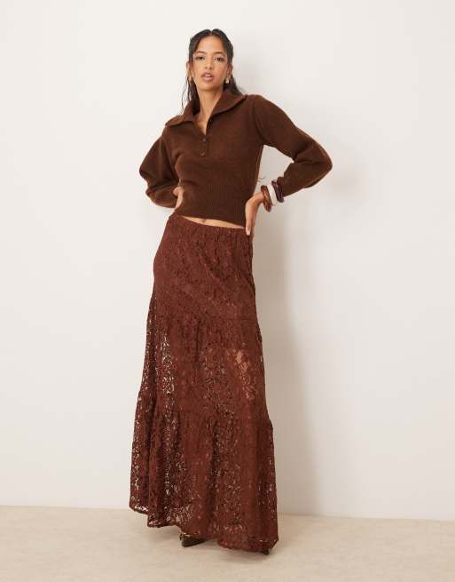 ASOS DESIGN - Gonna lunga marrone a balze in pizzo