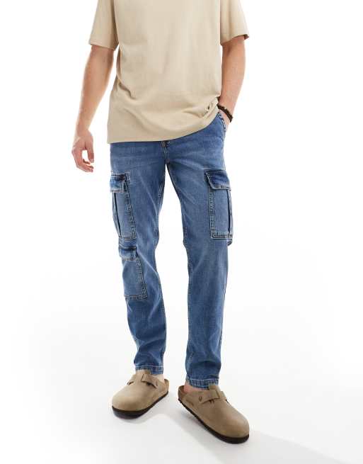 ASOS DESIGN - Jeans affusolati elasticizzati lavaggio blu medio con tasche cargo