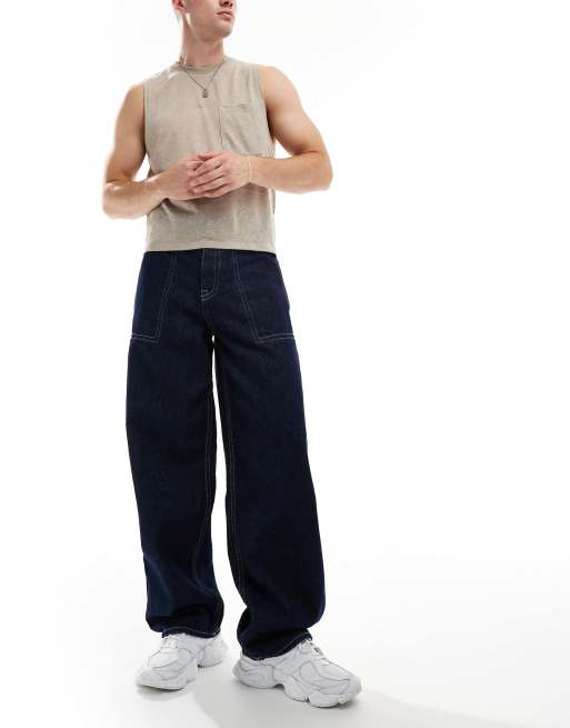 ASOS DESIGN - Jeans ampi blu rinse wash con cuciture a contrasto