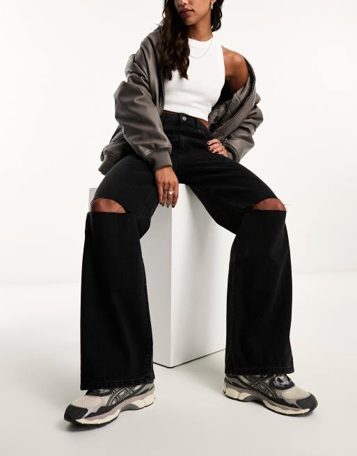 ASOS DESIGN - Jeans dad fit a fondo ampio nero slavato con strappi