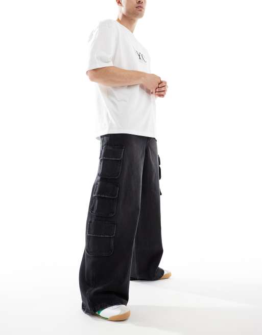 ASOS DESIGN - Jeans extra ampi nero slavato cargo con tasche