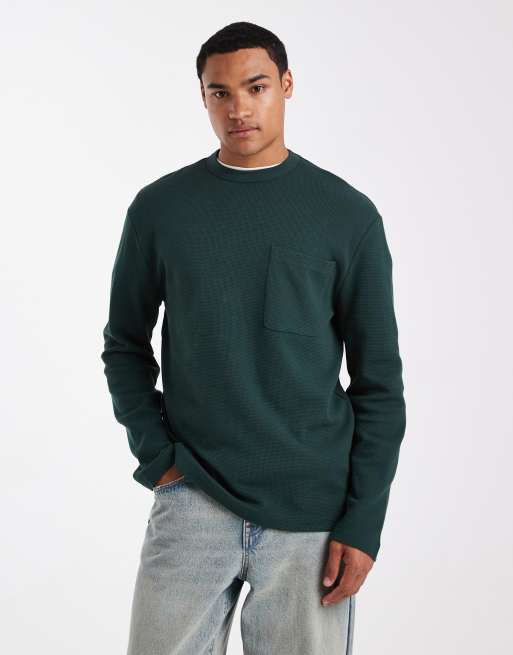 ASOS DESIGN - Maglietta a maniche lunghe vestibilità comoda in tessuto a nido d'ape verde con tasca